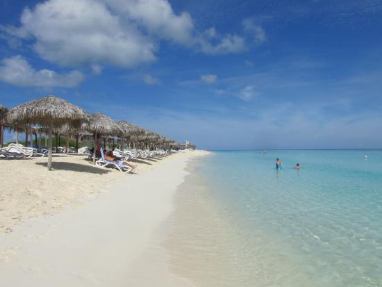 “La playa de Varadero, también conocida como Playa Azul, se extiende a lo largo de la estrecha península cubana (entre 700 y 1.200 m de ancho). Sus 22 kilómetros de playa se caracterizan por tener una franja de fina arena blanca y un suave descenso de su plataforma hacia el mar”.