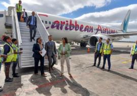 La nave Boeing 737-800 de Caribbean Airlines, la aerolínea nacional de Trinidad y Tobago, a su llegada al Aeropuerto Internacional José Martí, Cuba, en su vuelo inaugural, el 13 de enero de 2018.